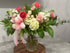 Gorgeous soft pink roses, stock and hydrangea accentuated with playful ranunculus, greens, and a bow in a clear vase.