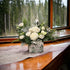 This beautiful evergreen ceramic cube arrangement is filled with luscious winter greens, cream roses, white lisianthus and hydrangea.